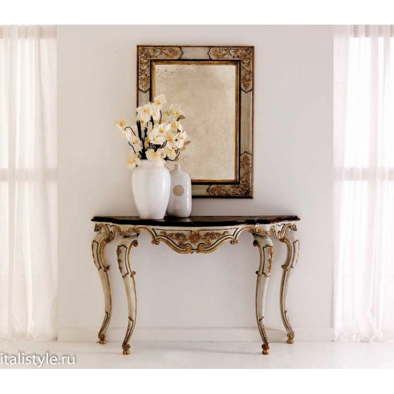 Шикарная пристенная консоль удачно дополнит ваш интерьер. Она имеет изящную полукруглую форму. Модель консоли была представлена в Милане в 2009 году на итальянской выставке Salone Internazionale del Mobile. Консоль изготовлена из натурального дерева, имеет изогнутые ножки и резную царгу. Позолоченная отделка и эффект старины в оформлении предают консоли роскошный богатый вид. Высокие ножки украшают шарики-наконечники. Столешница изготовлена из специального материала, имитирующего натуральный камень. Сюжет дополнит настенное зеркало, выполненное в таком же стиле.