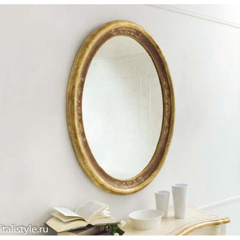 Итальянское настенное зеркало от Silvano Grifoni обрамлено в овальную раму из натуральной древесины. Модель выполнена в классическом стиле без применения резного декора. Рама оформлена в отделке под золото с эффектом искусственного старения. В её дизайне использована ненавязчивая ажурная роспись, которая придает зеркалу романтический образ.