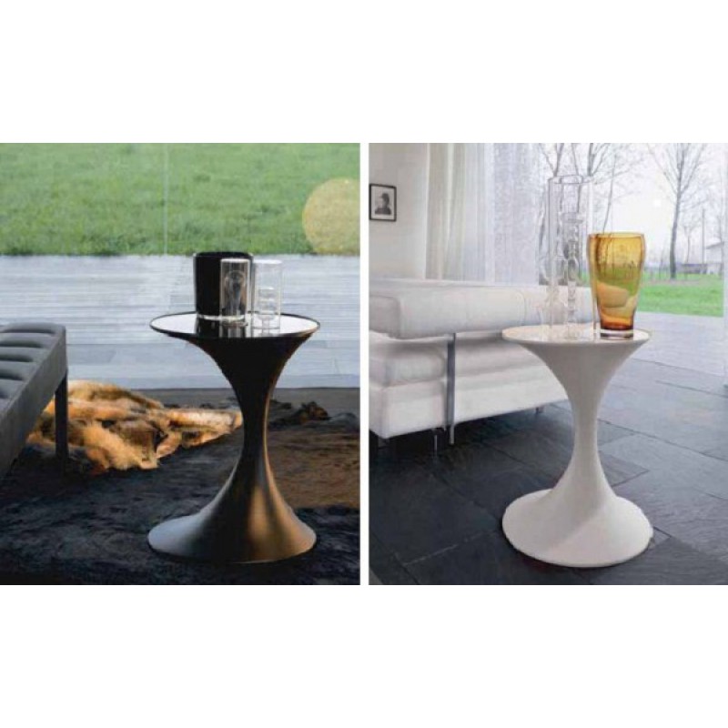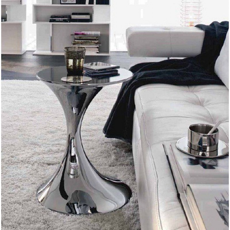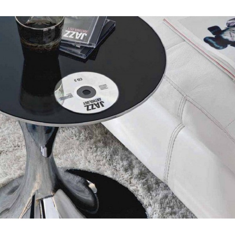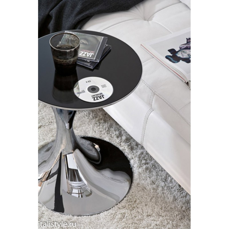 Приставной / кофейный столик на массивном пьедестальном основании. Материал - хромированный / покрытый матовым лаком металл; варианты цвета - черный / белый / шампань. Круглый топ выполнен из закаленного стекла, окрашенного в черный / белый / оттенок шампанского.
